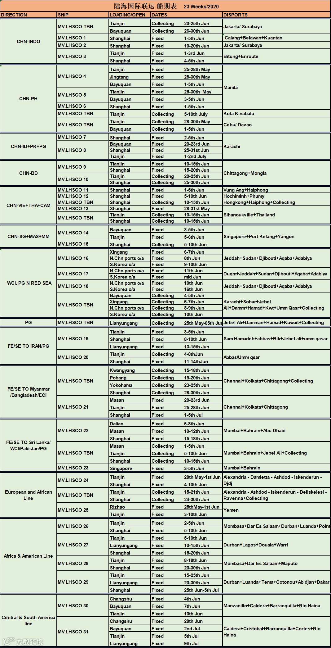 船舶动态 Fresh Tonnage Itinerary 2020-6-8 陆海国际联运
