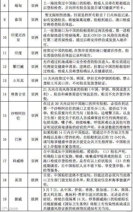 直接或者间接来自中国、韩国、日本、伊朗、意大利、中国香港、中国澳门、越南、马来西亚、印度尼西亚、泰国、中国台湾、阿联酋、卡塔尔、阿曼、科威特、菲律宾和新加坡(如果碰到货物运输)的船舶将在锚地接受检疫,直到离开上述国家的港口14天为止;