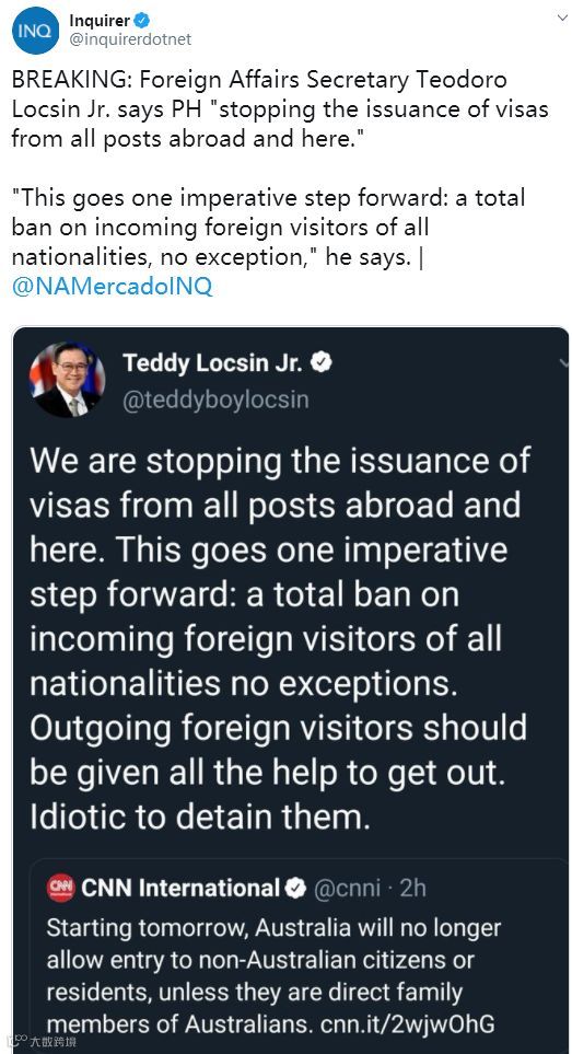 19日最新消息称,菲律宾外交部长特奥多罗•洛钦表示,菲律宾将“停止所有海外和国内签证的发放”工作。