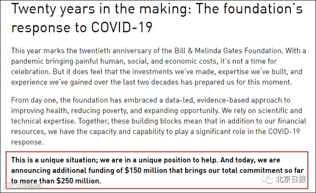 早在1月27日,盖茨基金会就宣布提供500万美元紧急赠款,支持中国抗击新冠肺炎疫情。2月5日,盖茨基金会又承诺投入最高1亿美元赠款,其中一部分用于直接帮助中国加速在药物、疫苗及诊断方法研发等方面的工作。
