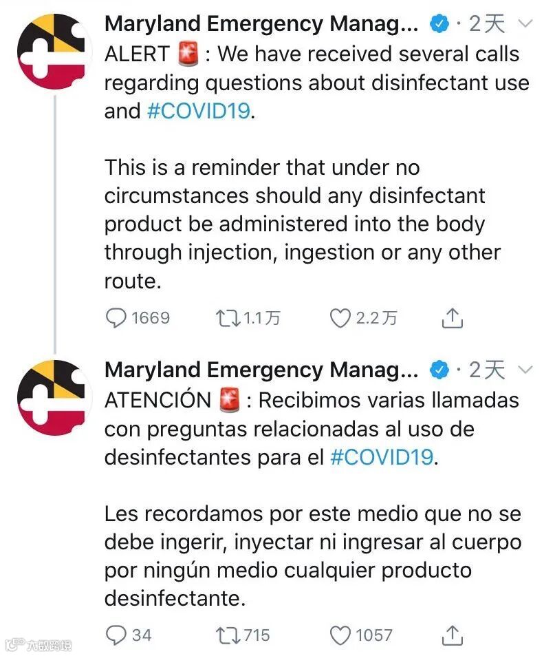 另外,全美多地的有关部门害怕事态失控,紧急出来澄清事实,劝公众不要喝消毒剂了。华盛顿的应急管理中心火急火燎地连发好几条推特,给民众科普消毒剂的正确用法。全球几大消毒剂厂商也紧急澄清:我们的消毒产品在任何情况下都不能通过注射、食用或其它途径施用于人体内部。