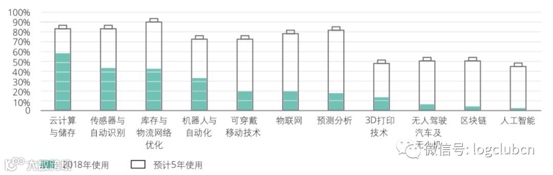 如今,大数据、云计算、自动化等技术开始在物流行业落地应用,但福佑卡车创始人兼CEO单丹丹曾在采访中表示,当前AI技术在物流业的应用还不足5%。2019年6月,知名咨询公司德勤也发布报告指出,2018年AI、无人驾驶技术在物流行业的采用率不足10%,预计在未来5年的使用率可以达到45%-50%。2018年物联网技术的采用率约20%,在5G等技术的推动下,未来5年使用率将接近80%。