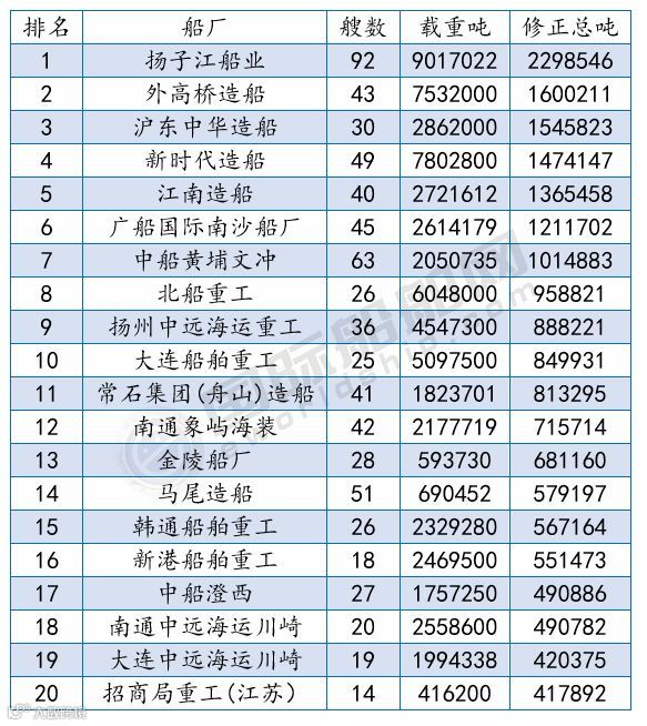 中国手持订单20强船厂榜单中,扬子江船业集团依然位居榜首。此外,招商局重工(江苏)进入20强,位列第20名。