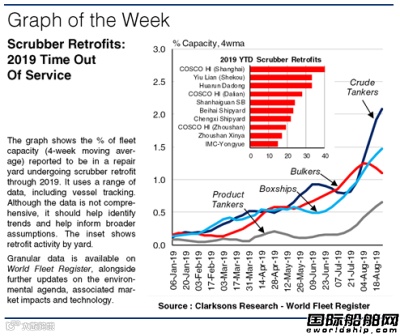 今年以来,脱硫装置改装活动增速加快。克拉克森之前估算2019年脱硫装置改装活动将导致全球主要船队约1%的船舶停运(原油船1.2%、集装箱船1.1%、散货船1.0%)。而在近几周,克拉克森观察到原油船船队的船舶停运时间似乎是主要船型中最多的——约1000万载重吨,接近船队运力的2.5%。