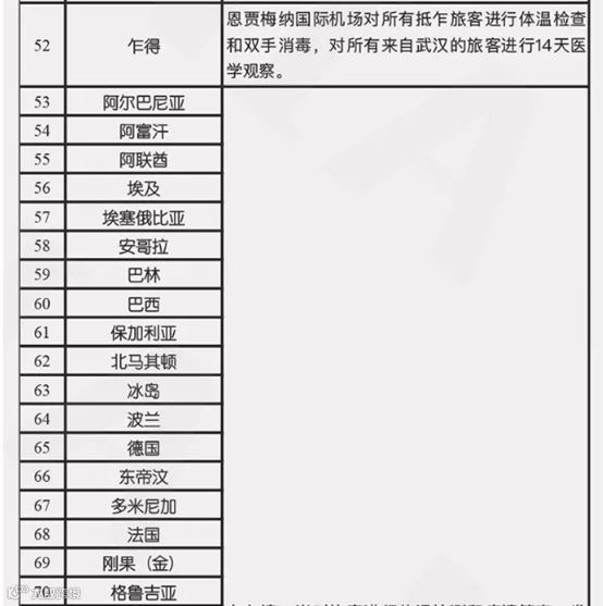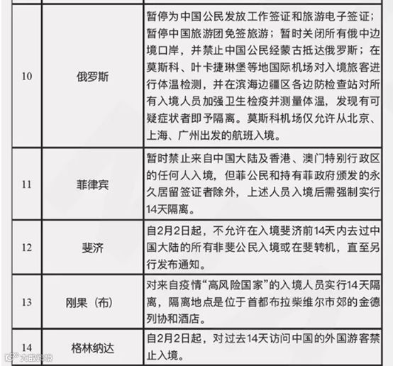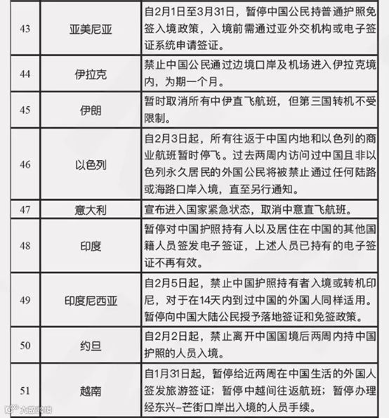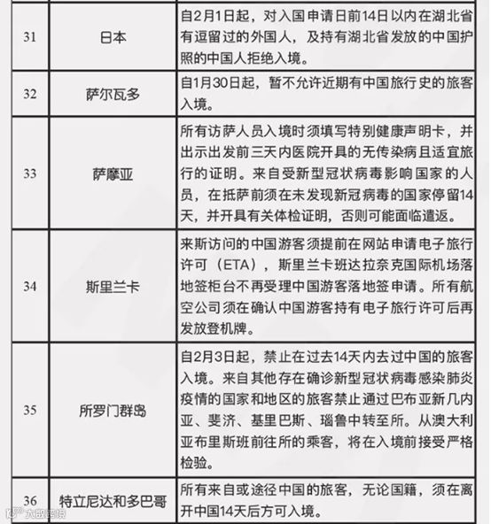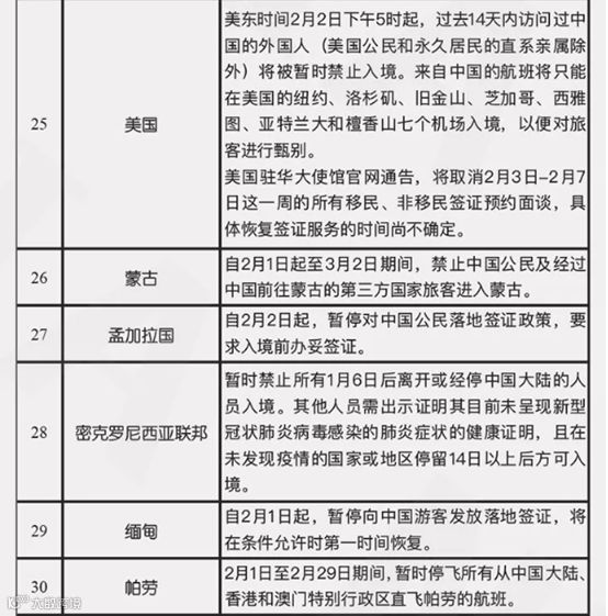 截止到2月4日6点10分国家移民管理局整理的有关国家入境管制措施提醒