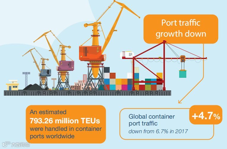 2018年,国际海运贸易增长显现疲态,这也反映了世界经济和贸易活动动力不足的现状。2018年的贸易量从2017年的4.1%增长到2.7%。增速放缓几乎影响到了所有相关产业,集装箱化全球港口吞吐量的增速从2017年的6.7%降至4.7%。