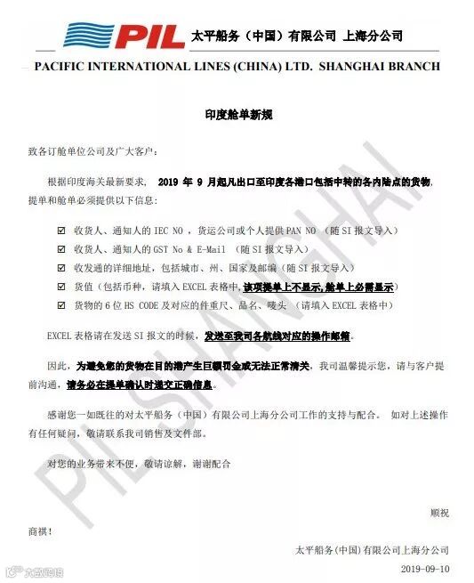 根据印度海关最新要求, 2019年9月起凡出口至印度各港口包括中转的各内陆点的货物,提单和舱单必须按要求填写,否则货物在目的港产生巨额罚金或无法正常清关。请务必在提单确认时递交正确信息。