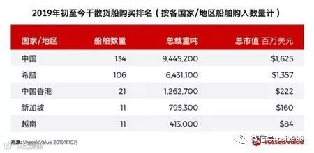 就干散货船市场而言,在二手市场上交易的所有干散货船中,约47%最终由中国购入。希腊排名第二,购买了106艘干散货船。