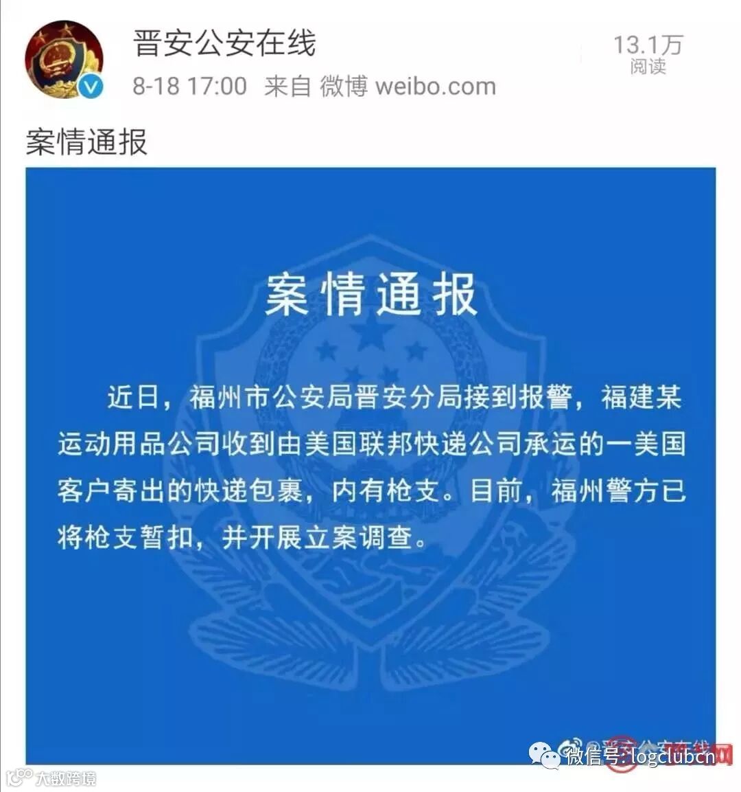 8月18日,晋安公安在线微博发出案情通报,称:福州市公安局晋安分居近期接到报警,福建某运动用品公司收到由美国联邦快递公司承运的一美国客户寄出的快递包裹,内有枪支。目前,福州警方已将枪支暂扣,并开展立案调查。(来源:罗戈网)