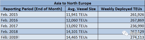 尽管亚洲-北欧贸易的利率普遍较低,但该贸易的平均集装箱船运量继续增加,如下图(图4)所示,该图表是根据Bluewater报告数据构建的。截至2月底,该行业的集装箱船平均运量为14465标准箱,比四年前增长21.1%,但比一年前略有增长2.6%。