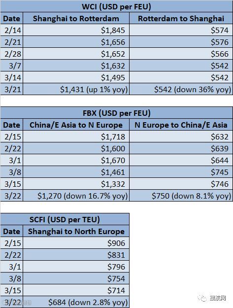 然而,根据上海航运交易所(Shanghai Shipping Exchange)的上海集装箱运价指数(SCFI)、德鲁世界集装箱指数(WCI)和波罗的海货运指数(FBX)的综合数据,近几个月来,现货集装箱运价普遍持续下跌。尽管这三个指数在近几个月都显示出低迷,但截至3月初,它们的年同比业绩喜忧参半,如下图(图一)所示。图1自3月初以来,所有三个指数一周内继续下滑,截至3月21日,WCI为1293美元/英尺,截至3月22日,FBX为1280美元/英尺,截至3月22日,SCFI为727.88美元。