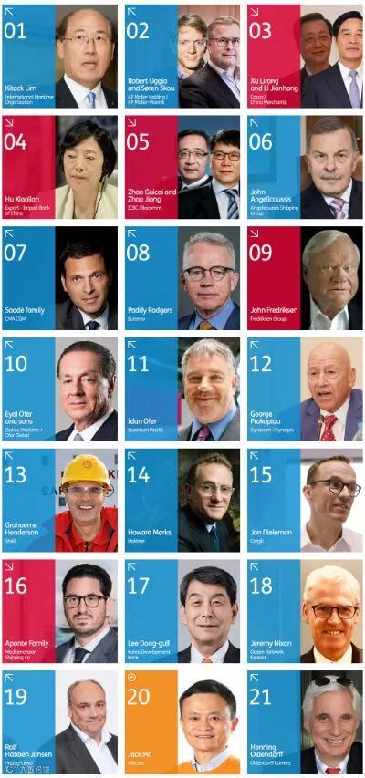 而在第11名至100名,入选的中国人士中最抢眼的就属第20位的阿里巴巴马云,马云为首次进入该名单。其他人还包括第27位的中石化总经理戴厚良,第56位的中国船舶重工集团董事长胡问鸣和中国船舶工业集团董事长雷凡培,第90位的长荣海运张国华,第100位的扬子江船厂董事长任元林。