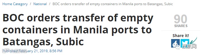 据搜航网获悉,为了解决港口拥堵问题,菲律宾海关已经下令将马尼拉港(Port of Manila, POM)和马尼拉国际货柜港(Manila International Container Port, MICP)所有空箱转运至八打雁港(Batangas)和苏比克湾港(Subic)。