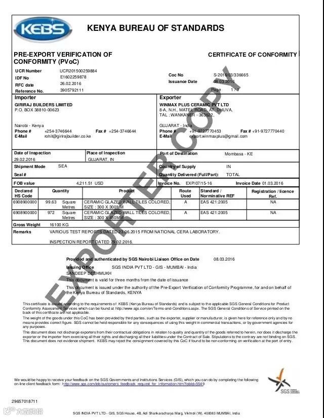 中国CCIC及SGS远东地区已经被肯尼亚标准局停止授权COC业务,肯尼亚标准局已不认可中国CCIC及SGS远东地区(1、日本 2、韩国(南北) 3、印度尼西亚 4、马来西亚 5、菲律宾 6、泰国7、新加坡 8、越南 9、柬埔寨)所签发的COC证书。而所有出口到肯尼亚的货物都要COC证书,包括以前不需要提供认证的货物。后续出口到肯尼亚的货物,可进行认证的机构有:BV、ITS、被授权中国SGS.