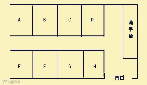题目:你要去一个布局如下图的公共卫生间,里面没有一个人,那么凭直觉你会选择去哪个小间方便呢?