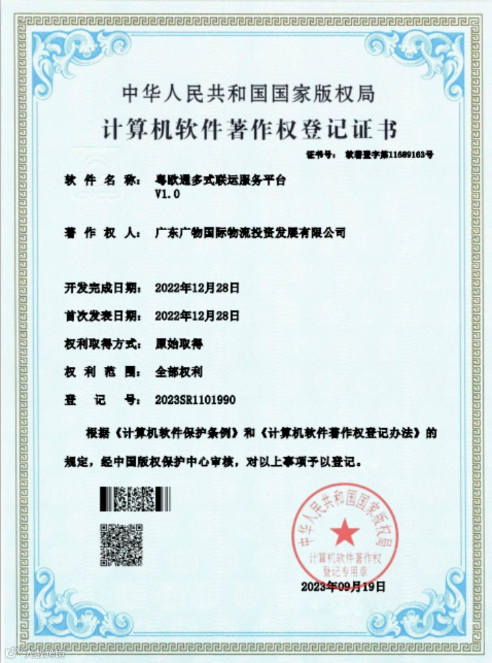 近期,国际物流公司自主研发的《粤欧通多式联运服务平台》与《集卡运输服务系统》两大软件成果成功获得国家版权局的认证与登记。