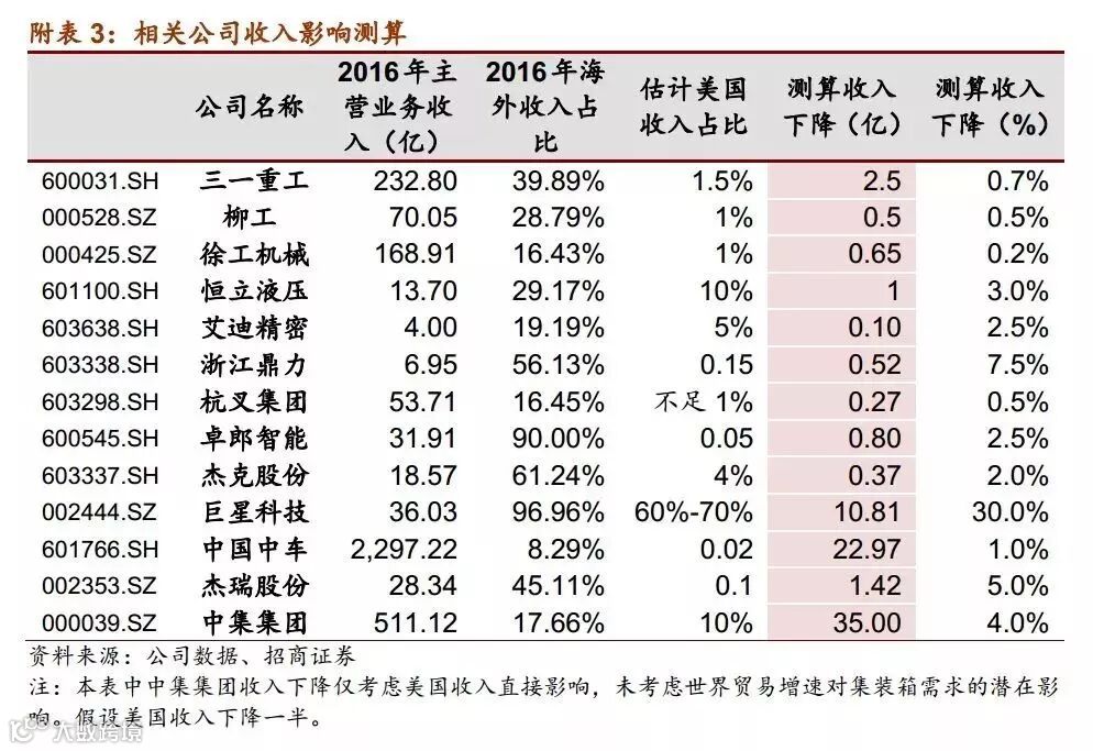 三一重工:估计2017年美国收入5亿元,占比小于1.5%,海外主要客户为拉美、印度和东南亚,受到影响较小,三一海外收入中60亿来自德国普茨曼斯特,面向全球销售(主要是欧洲),不受中美贸易战影响;另外没有美国进口零部件,个别出口的用康明斯发动机。徐工机械:2017年出口600万美元,加上集团的挖掘机共2000万美元,出口占比不到1%,主要出口一带一路国家;另外没有美国进口零部件。柳工在北美地区的销售收入占比不到1%。核心零部件恒立液压海外占比30%,大客户卡特占出口30%-40%,估计美国收入占比约10%。艾迪精密海外收入占比约12%,估计美国占比5%左右。高空作业平台行业的浙江鼎力美国收入占比约15%,而且浙江鼎力战略是大力开拓美国市场,可能受到影响较大。杭叉集团海外收入占比17%左右,出口北美和欧洲较多,美国是其第三大市场(3%左右),在美国有一家控股子公司以及多方位布局,也会受到一定影响。安徽合力出口美国的收入占比仅千万之八,大概年1000台左右,影响较小。
