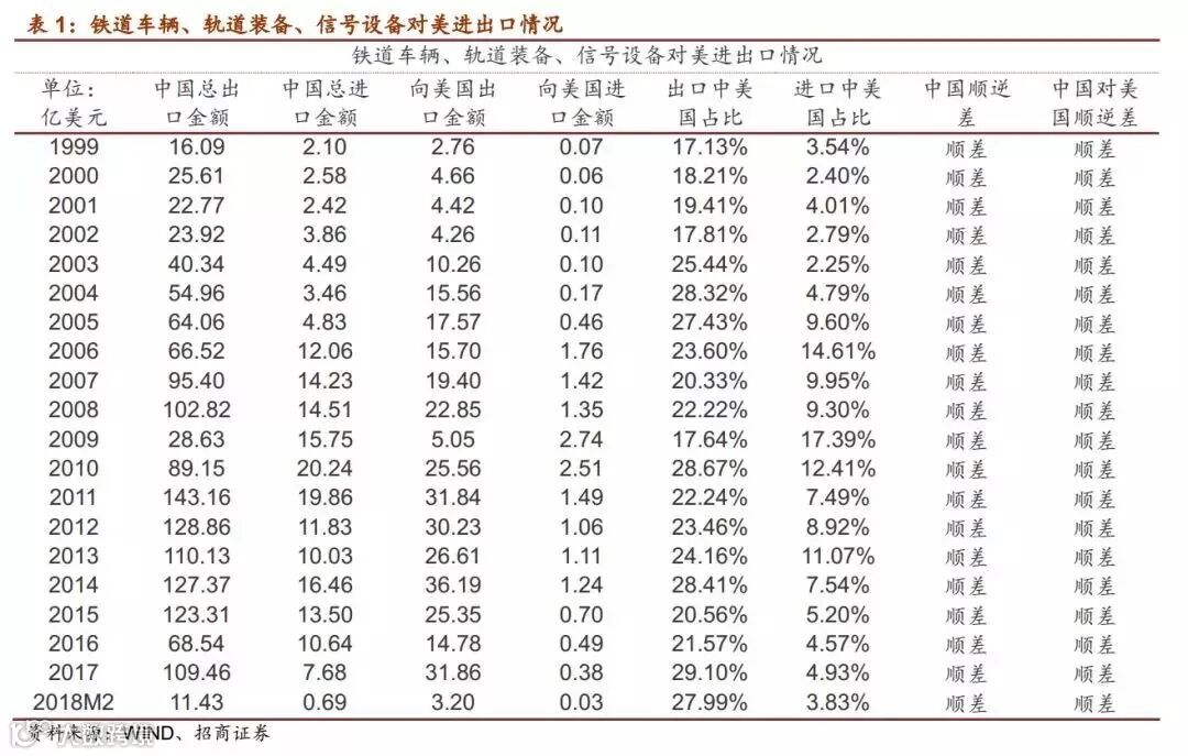 1、高铁装备领域:静态看对收入实际影响较小,但拓展美国高铁市场难度加大。根据中国海关总署统计,2017年我国的铁道车辆、轨道装备、信号设备向美国出口额为31.86亿美元,占中国总出口额的29.10%,向美国进口额为0.38亿美元,占中国进口额的4.93%。我国向美国出口近30亿美元的铁道车辆、轨道装备、信号设备有可能要面临25%的关税惩罚。