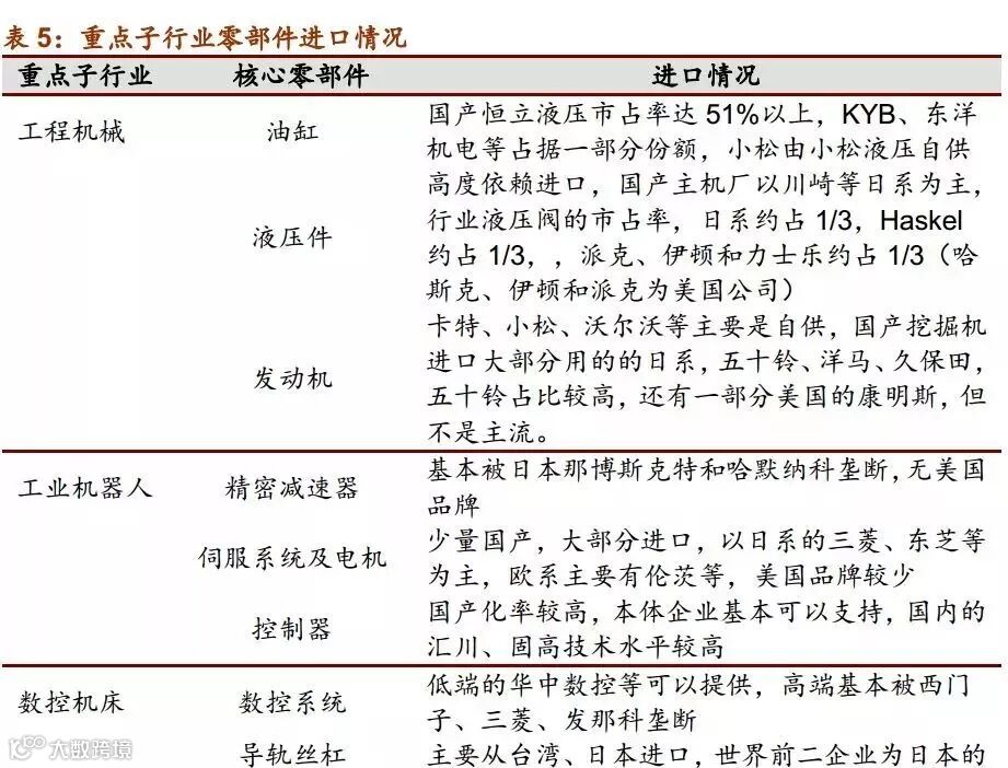 重点子行业美国零部件进口情况:重点子行业进口方面,除了工程机械液压件领域,美国的派克、哈斯克、伊顿占有一定市场份额外,在工业机器人、数控机床等领域,美国品牌的进口零部件非常少。
