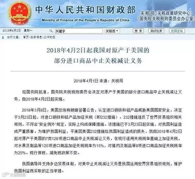 为平衡美方232措施(即对进口钢铁和铝产品加征关税)对中方造成的利益损失,昨日(4月2日)经国务院批准,国务院关税税则委员会决定对原产于美国的部分进口商品中止关税减让义务,自2018年4月2日起实施。这意味着中国吹响贸易反制措施的号角,中美贸易战摩擦升级。