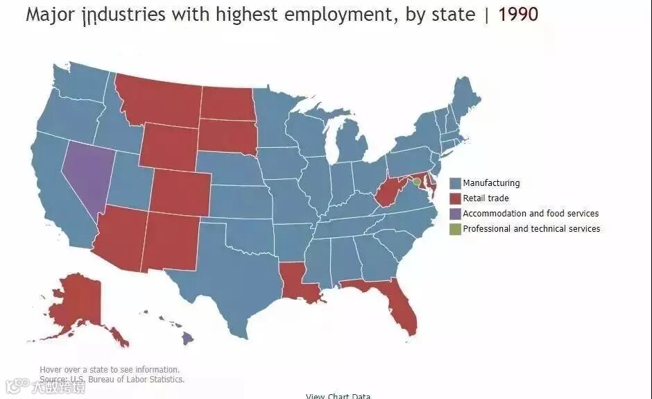 2008年金融危机之后,美国经济遭遇重创,加上长期依赖金融,制造业外流严重,元气大伤。看下面的统计图,清晰地呈现美国如何从一个制造业大国变成一个服务型国家的。