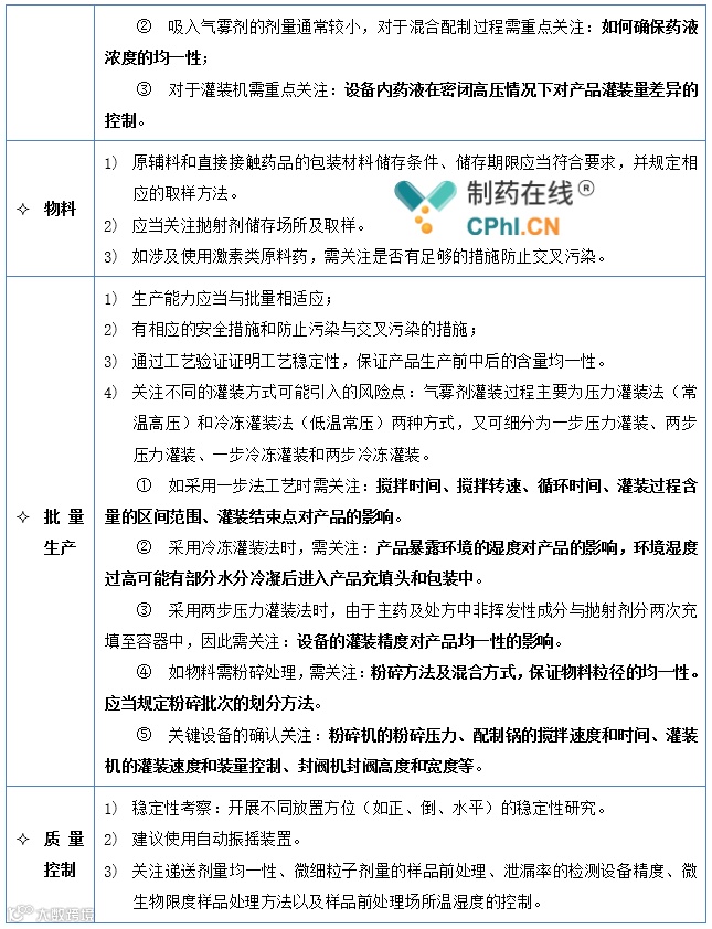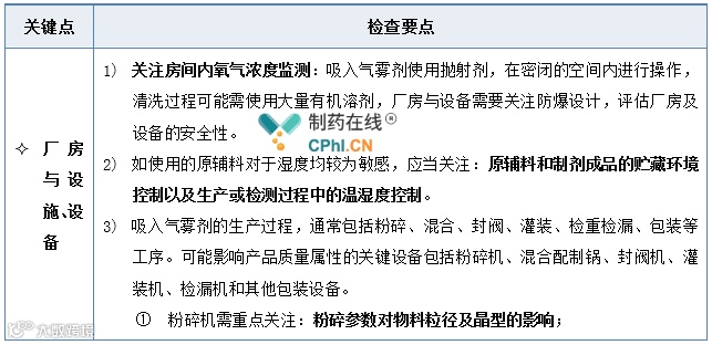 结合吸入制剂特点,从厂房与设施、设备、物料、批量生产、质量控制等方面识别可能存在的与吸入制剂特点相关的风险,为药品注册核查实施提供参考。通用的核查要点参见《药品注册核查要点与判定原则(药学研制和生产现场)(试行)》,笔者梳理吸入制剂(以吸入气雾剂 为例)需额外关注如下内容: