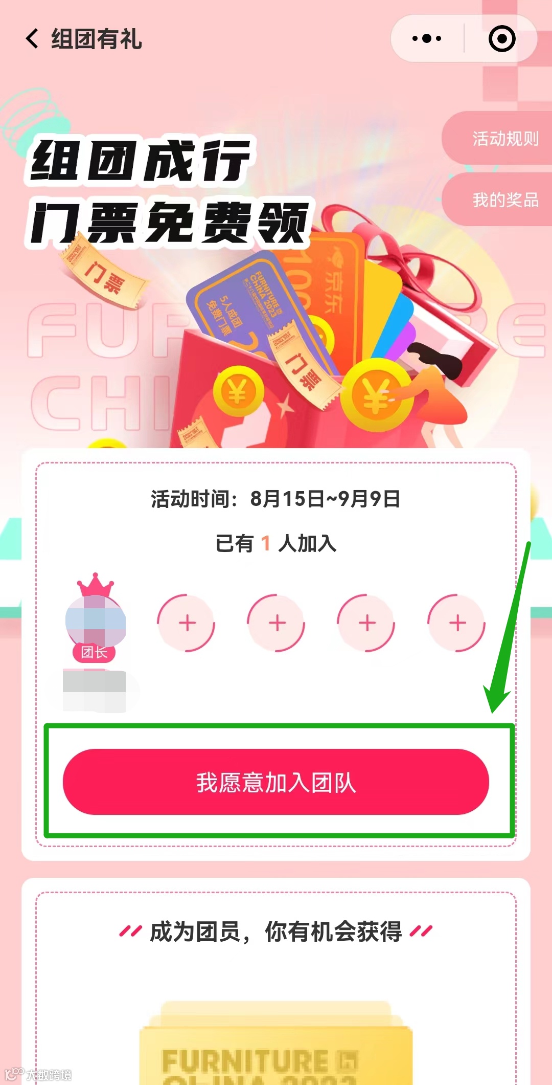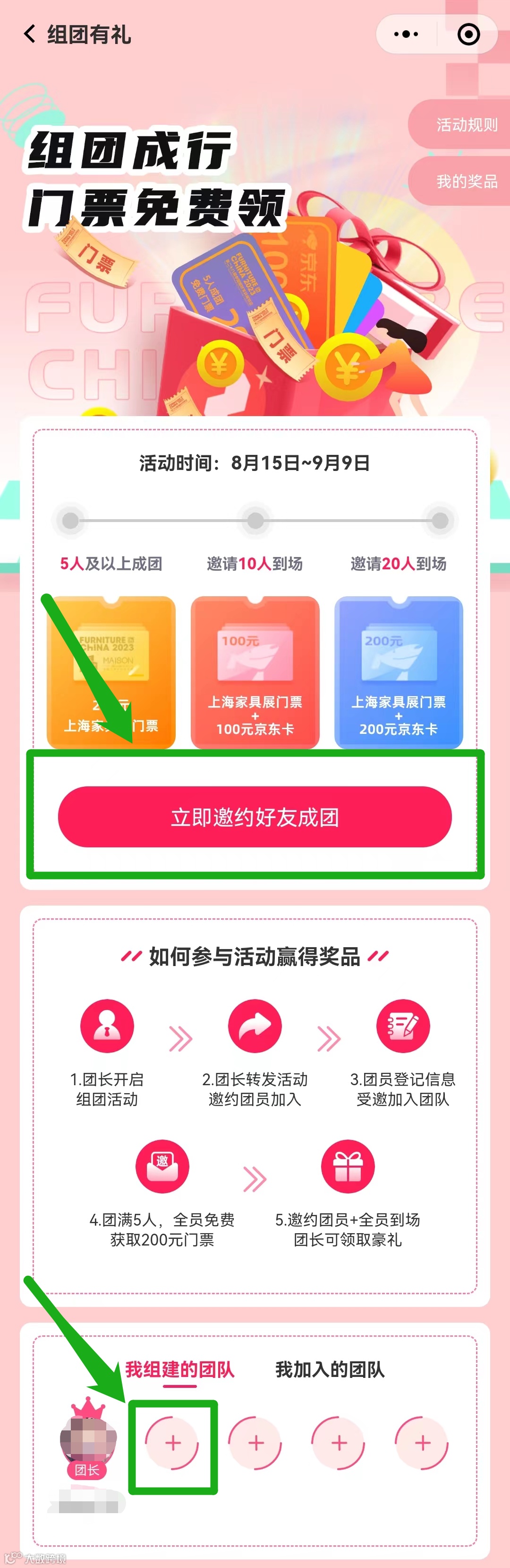 胜利在望!点击“立即邀约好友成团“或下拉页面,在“我组建的团队“内,点击”+“号,将小程序链接分享给您邀请的团员,一起免费嗨逛现场吧!