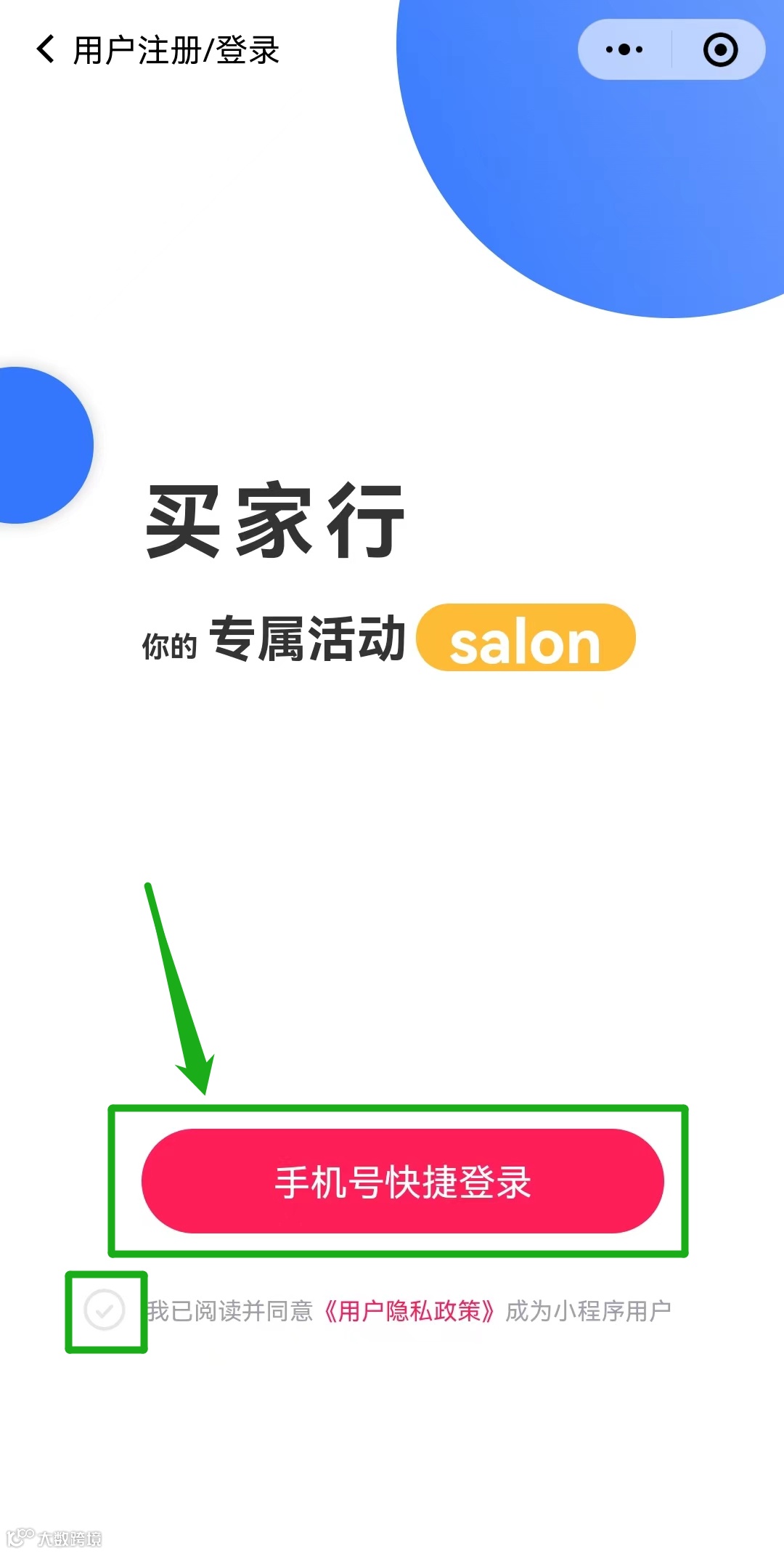 进入小程序,未注册的小伙伴请先点击按钮“手机号快捷登录”,并勾选下方同意按钮,完成首次登陆注册。