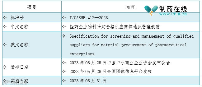 对于制药企业,物料采购合格供应商筛选及管理是药品GMP实施的关键环节之一,制药企业必须充分认识到做好供应商管理的重要性,从源头上把好产品质量关。2023年05月26日,全国团体信息平台官网发布了由中国中小商业企业协会组织起草的《医药企业物料采购合格供应商筛选及管理规范》(T/CASME 412—2023)团体标准,该标准于2023年05月31日起实施,此团体标准规定了医药企业物料采购合格供应商筛选及管理过程中的部门职责、筛选流程、供应商管理等内容。