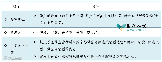 《医药企业物料采购合格供应商筛选及管理规范》起草单位、起草人和主要技术内容