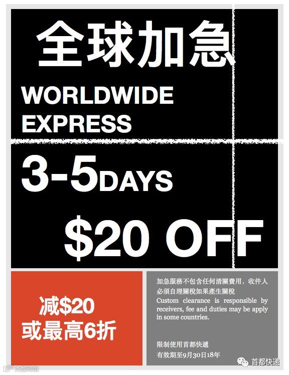 使用本信息可获前所未有的取疯狂折扣:选用3-5天全球加急服务,马上享受20美元折扣或高至6折的优惠,9月30日截止