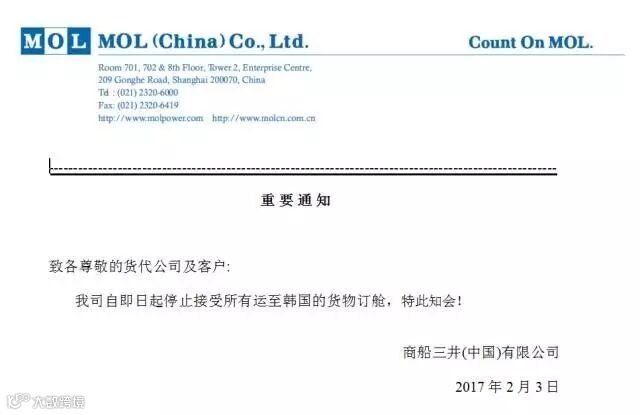 日本三大船公司之一的——商船三井(MOL)近日发出通知,从2月3日起,停止接受所有运至韩国的货物订舱。