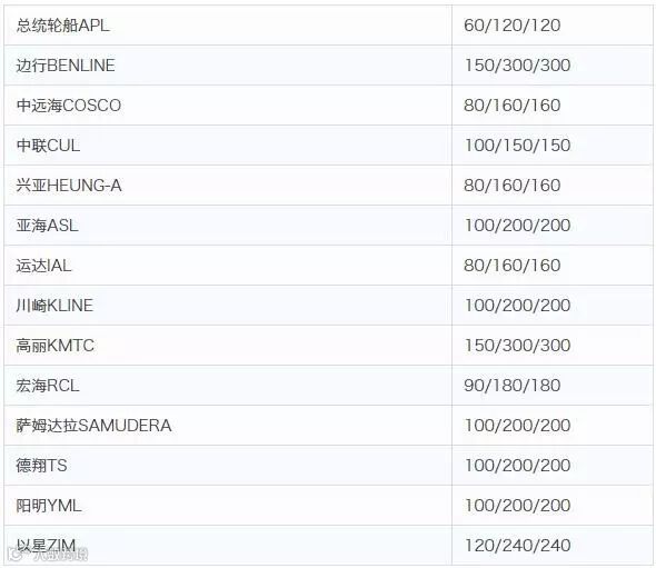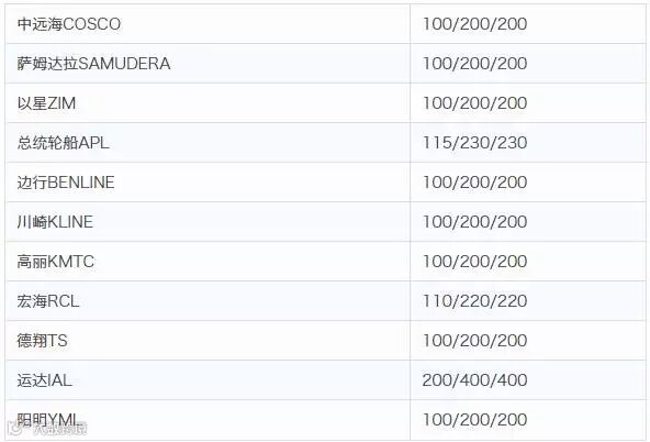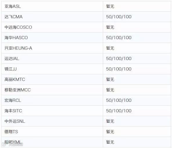 备注:50/100/100:50/20GP;100/40GP;100/40HQ。币种为美金。