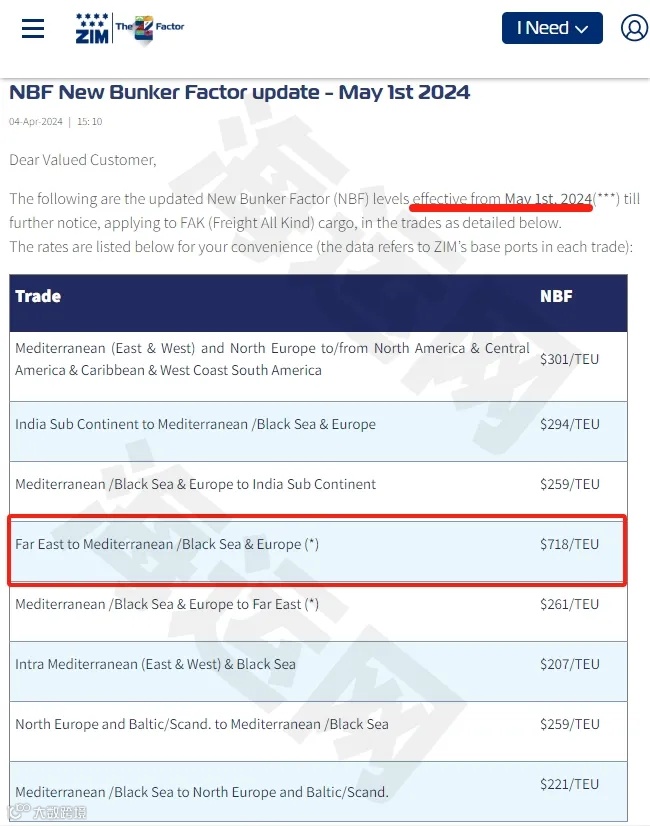 以星航运ZIM4月4日发布通知,自2024年5月1日起,实施更新后新的燃油系数(NBF)水平,直至另行通知,适用于FAK(所有种类运费)货物,其中远东至地中海/黑海和欧洲的收费标准为718美元/TEU。大约是其任何其他航商的三倍。