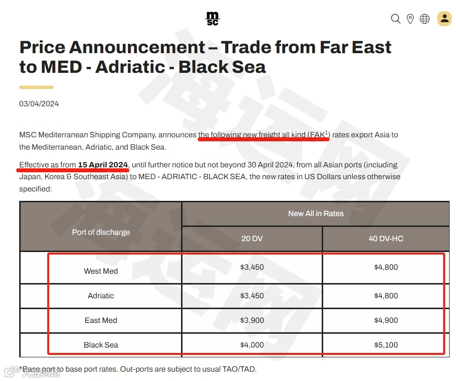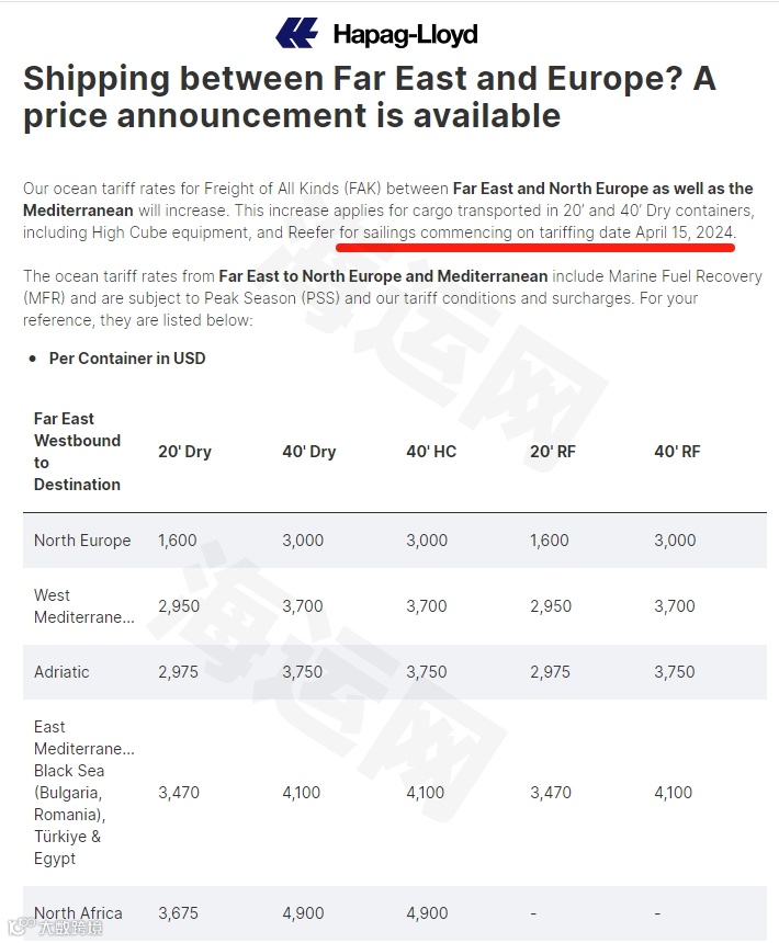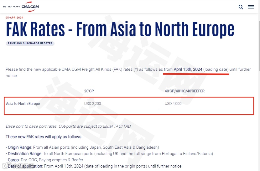 4月5日,达飞官网发布最新公告称,4月15日起(装货日期),再次调升亚洲至北欧新的FAK费率,每20英尺集装箱2200美元,40尺柜包括高柜和冷藏箱4000美元,直至另行通知: