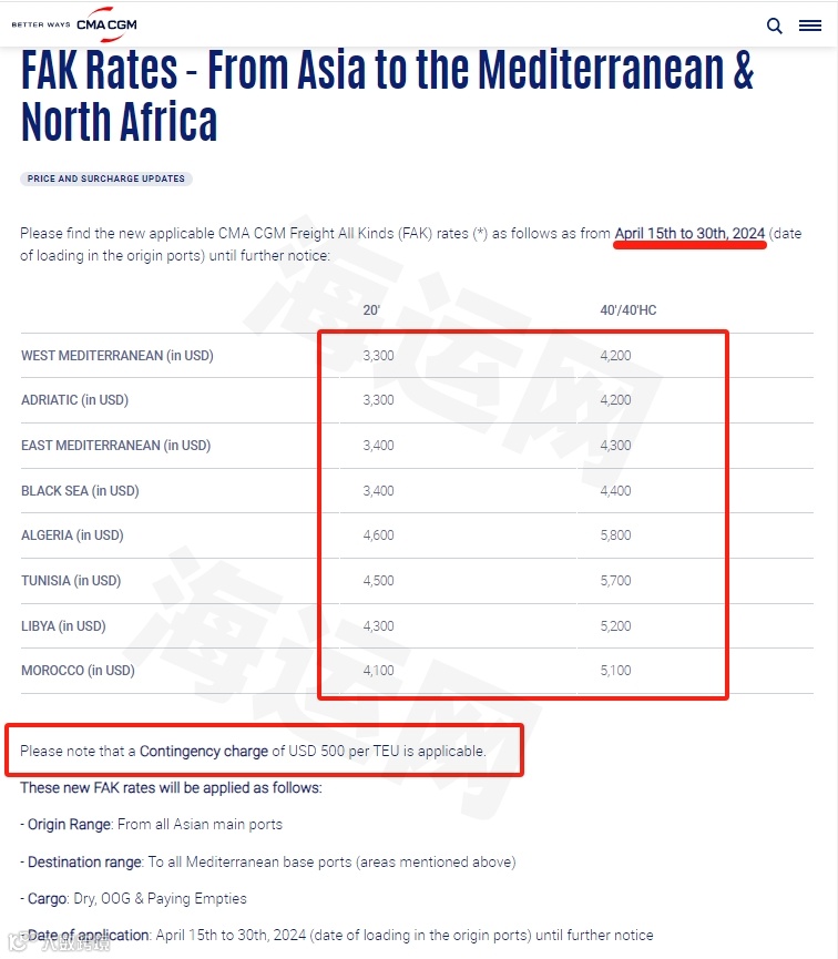 请注意,这家法国航运巨头宣布,也适用于每TEU 500美元的应急费用。