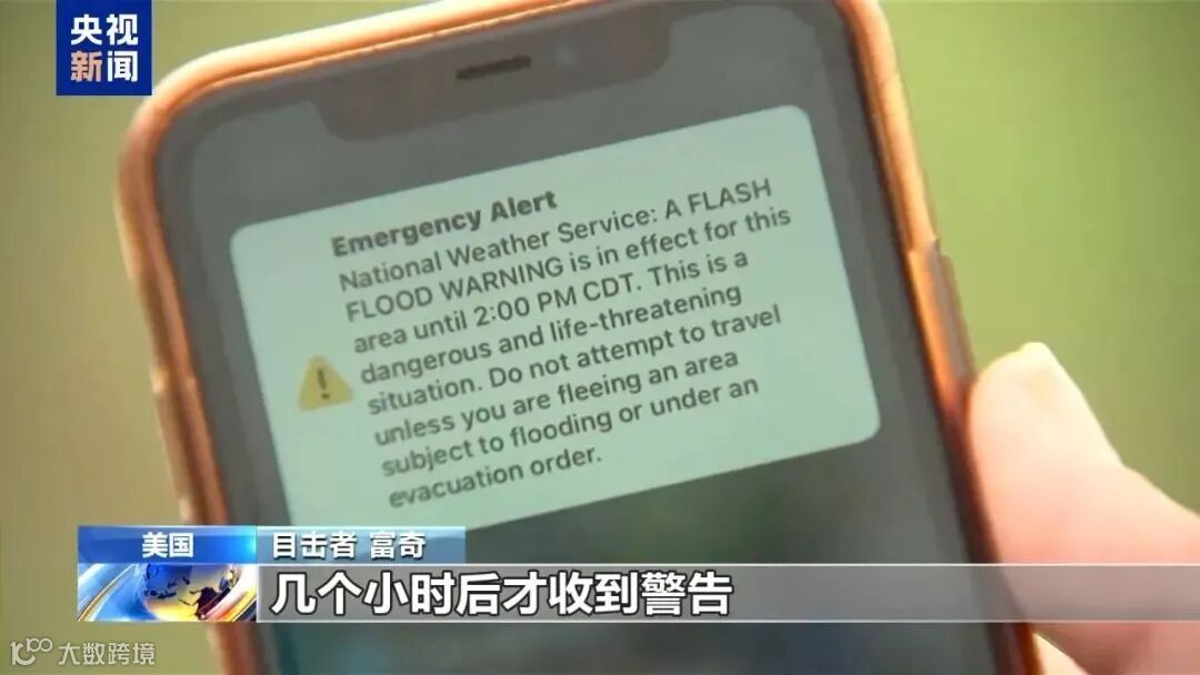 据报道,当地时间4日凌晨1时14分,美国国家气象局向克尔县部分地区发布山洪预警。凌晨3时,克尔县已发生严重山洪。凌晨4时许,美国国家气象局才向沿河居民和营地人员手机发送无线紧急警报。