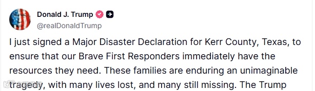 当地时间7月6日,美国总统特朗普在社交媒体平台“真实社交”上发布消息,宣布已签署得克萨斯州克尔县的重大灾难声明,此举旨在确保急救人员能立即获得所需资源。同时,特朗普政府称会继续与州、地方领导人保持密切合作。