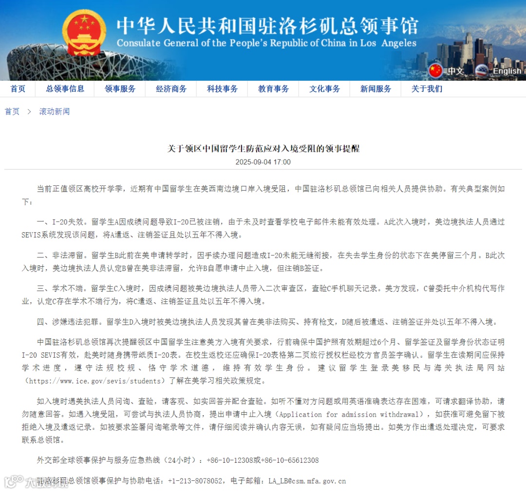 中国驻洛杉矶总领馆近日发布公告,提醒学生切勿忽视入境要求,并列举了数起典型案例。