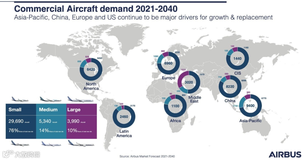 2021年到2040年期间,亚太地区、中国、欧洲和美国地区将继续成为航空业客机增长和老旧飞机退役的主导因素。未来20年内,全球小型商用飞机需求将达29690架,占总体商用飞机需求的76%,其中北美、欧洲、中国和亚太地区需求占比最大;全球中型商用飞机需求量为5340架,占总体商用飞机需求的14%,亚太地区和欧洲地区需求占比最大;全球大型商用飞机需求量为3990架,占总体商用飞机需求的10%,中东地区和亚太地区需求占比较大。
