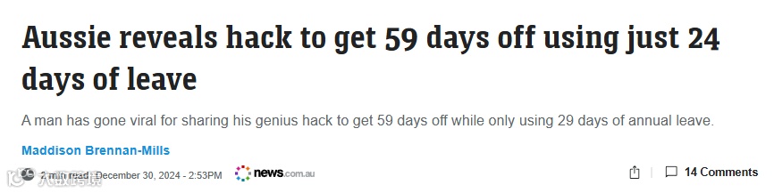 到底是什么样的攻略呢?我们一起来看看!其实,只要稍作准备,澳洲人仅用 24 天年假,就能摇身一变,拥有 59 天的悠长假期。原则上来说,通过巧妙地将年假与公共假日、周末结合,许多澳洲上班族确实明年有望迎来超长时间的假期。而这位男子更是成功找到了休假最大化的秘诀,用最少的年假天数,换来最多的休息时间。在一段TikTok热门视频中,博主 @michael.rusli 详细讲解了如何通过巧妙布局,仅使用 24 天年假,就能让全年拥有 59 天的休假。
