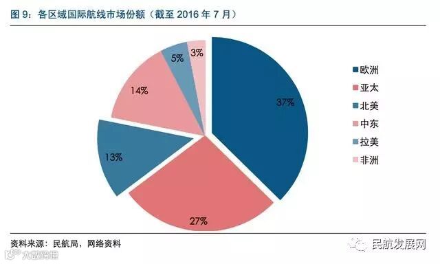 截至 2016 年 7 月,欧洲地区国际航班的客运周转量占全球国 际客运周转量的 37%,亚太地区国际航班的客运周转量占全球国际客运周转量的 27%。