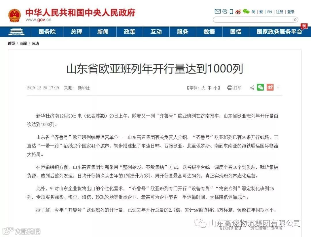 12月20日,中国政府网刊发题为《山东省欧亚班列年开行量达到1000列》文章,第一