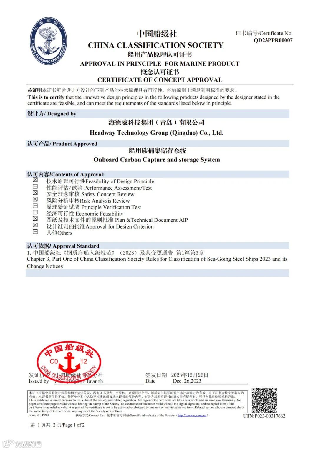日前,海德威科技集团(青岛)有限公司自主研发的海洋卫士®碳捕集与再利用系统正式取得由中国船级社授予的原理认可证书(AIP)。这是继DNV和RINA船级社之后,该产品取得的第三张来自权威船级社的AIP证书,标志着海德威在船用碳捕集系统领域已走在行业前列,创新研发实力和技术水平获得业界广泛认可。