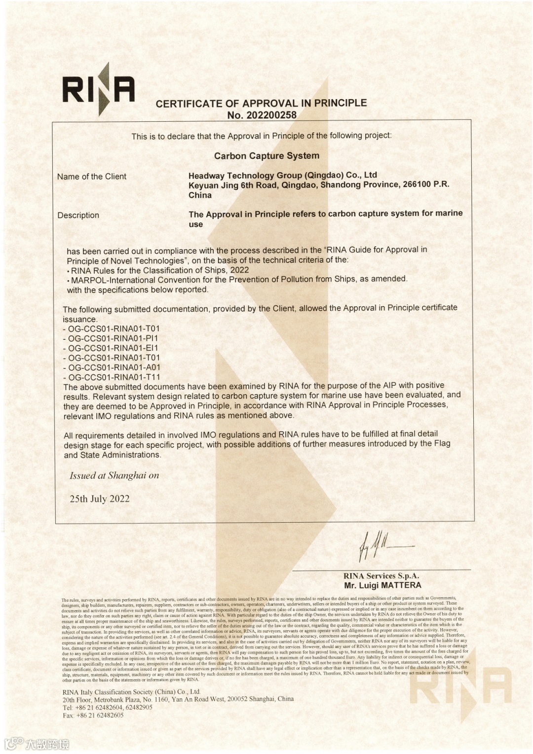 日前,由海德威科技集团(青岛)有限公司自主研发的海洋卫士®船舶二氧化碳碳捕集与储存系统(CCSU),正式取得由RINA船级社授予的原理认可证书(AIP),成为国内首家取得该证书的CCSU厂商。该系统具有脱碳效率高、体积小、能耗低、储运便捷等诸多优势,能够为船舶应对CO2减排提供节能、高效的解决方案。