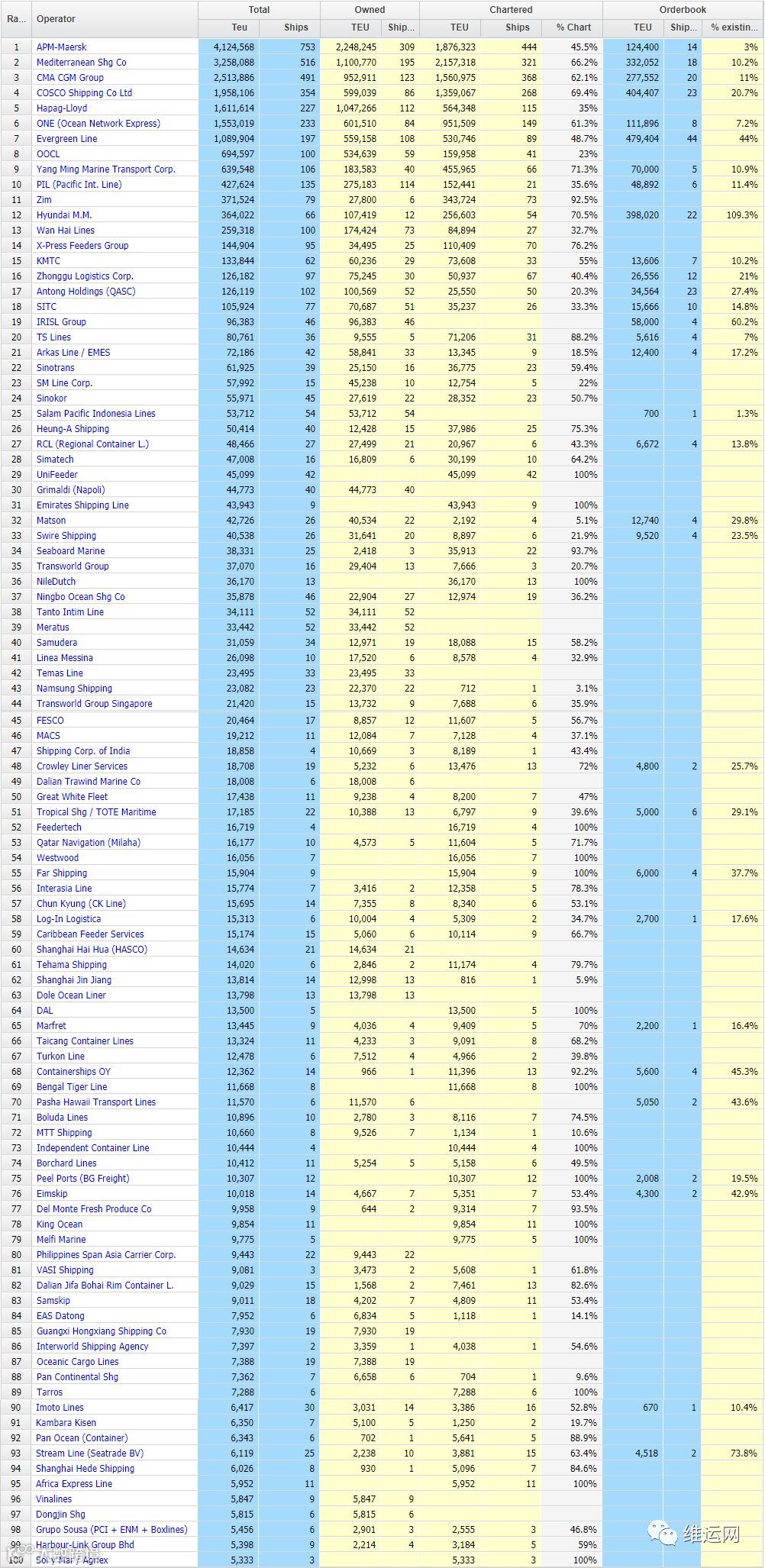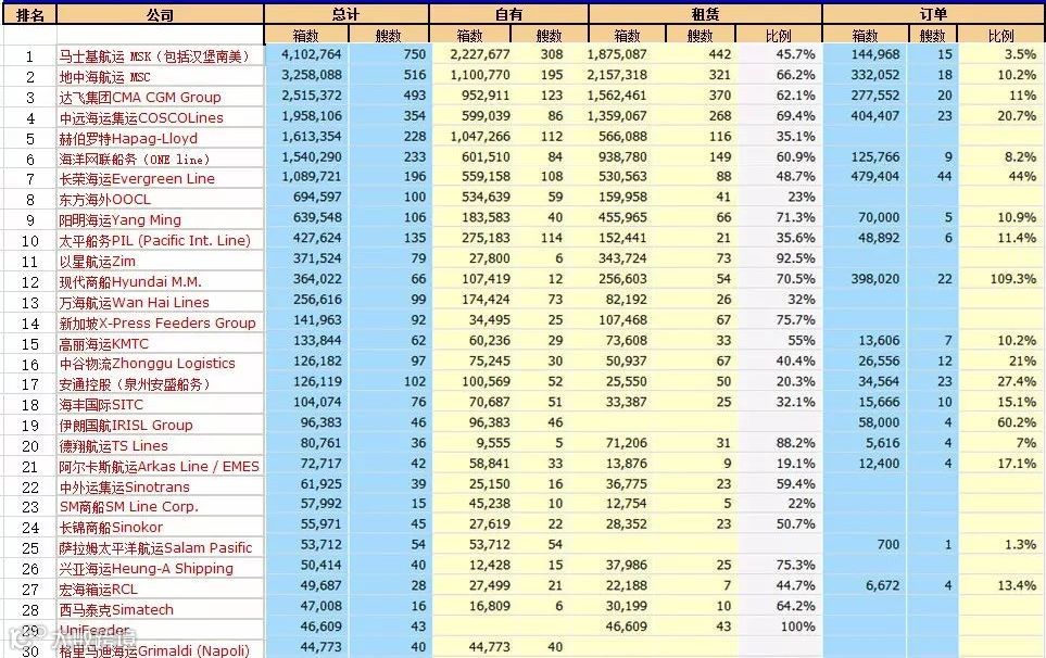 根据Alphaliner最新运力数据统计,截止2018年5月1日排名前20依次为:马士基航运、地中海航运、达飞轮船、中远海运集运、赫伯罗特、海洋网联船务、长荣海运、东方海外、阳明海运、太平船务、以星轮船、现代商船、万海航运、X-Press Feeders、高丽海运、中谷海运、安通控股、海丰国际、伊朗国航、德翔航运。