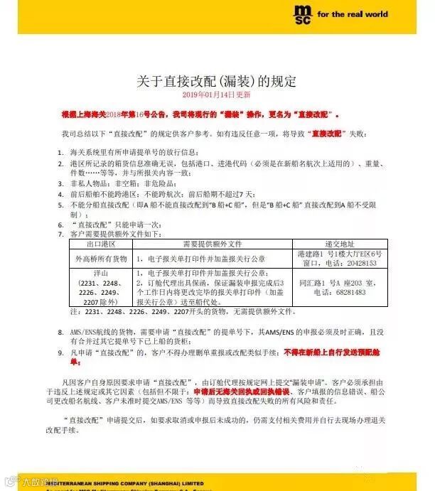 1月14号,根据MSC船公司最新通知显示,“直接改配”又有新规定!上海中外运也发布了关于新舱单流程下预配舱单更改、改配(落货)流程详情,各位外贸货代注意看,以免清关受阻。