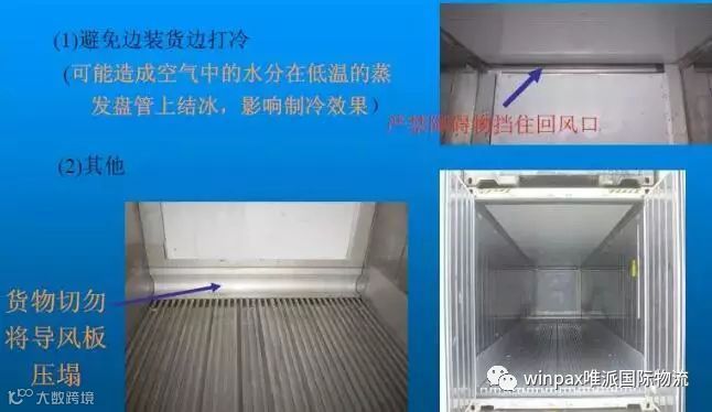 货物预冷对货物应进行预冷处理,并预冷到运输要求的温度,因冷箱设计制冷能力有限,仅能用于保持货物的温度。如果货物温度过高,将使制冷系统超负荷工作,导致该系统出现故障,影响货物安全。