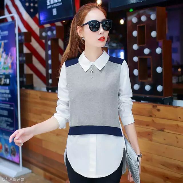 2017春新款圆娃娃领长袖拼接修身显瘦假两件衬衣