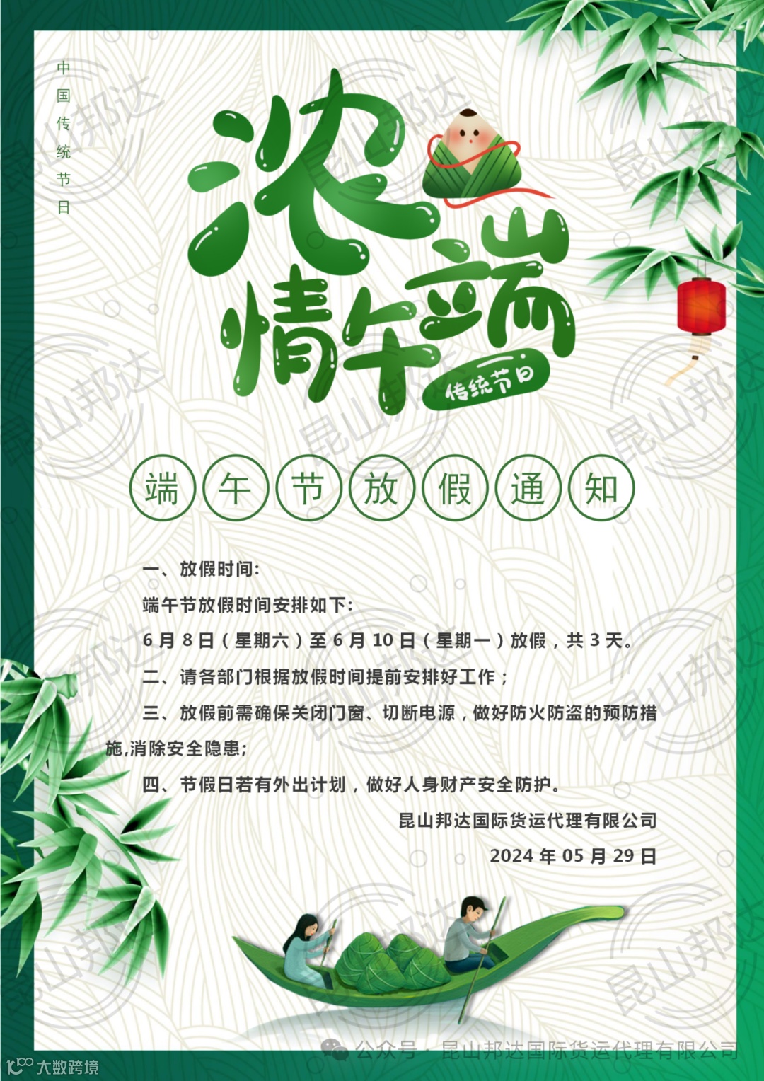 为了让员工与家人共同度过这个重要的传统节日,我司于6/8-6/10三天放假,以便员工有更多的时间与家人团聚,体验传统文化。我们在此提前通知客户,若在端午节期间有紧急出货需求,依然可以联系我们,我们将尽力配合安排。